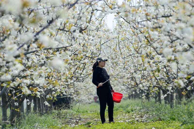 ↑在河南省驻马店市汝南县宿鸭湖街道五里岗村,当地果农为梨树人工授粉(4月1日摄)。新华社发(孙凯摄)