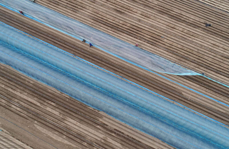 ↑在河北省赵县韩村镇,农民在搭建姜棚(3月30日摄,无人机照片)。新华社记者杨世尧摄