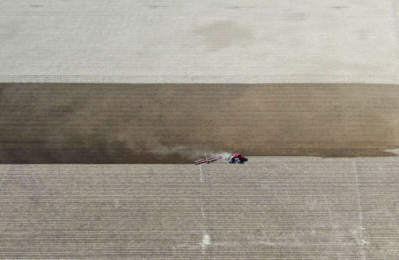 ↑在新疆沙湾市一处棉田里,农民驾驶拖拉机犁地(4月2日摄,无人机照片)。新华社记者 赵戈 摄