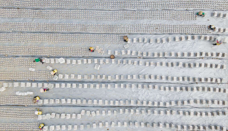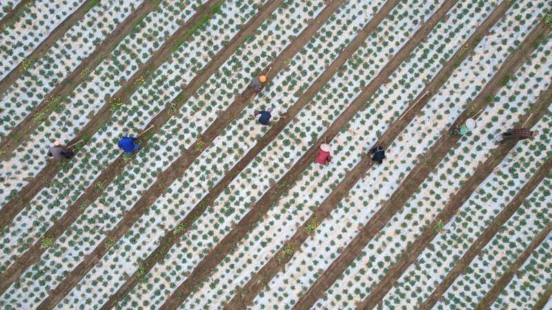 ↑在贵州省铜仁市万山区敖寨乡中华山村食用菌种植基地,农民在田间摆放菌棒(4月4日摄,无人机照片)。 新华社发(彭俊 摄)