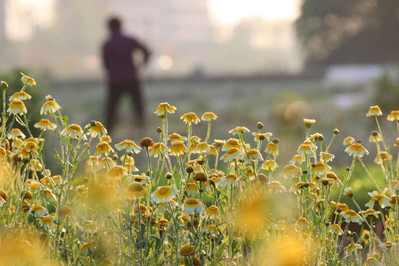 ↑农民在江苏省太仓市璜泾镇新华村的蔬菜种植基地除草(4月1日摄,无人机照片)。新华社发(计海新 摄)