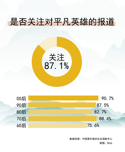 在生活中,很多平凡人用他们的使命担当,展现了平凡的伟大。在今年清明节,中国青年报社社会调查中心联合问卷网(wenjuan.com),对2048名受访者进行的一项调查显示,87.1%受访者平时会关注平凡英雄的报道,00后关注的比例更高(90.7%)。崇敬平凡英雄,64.9%受访者认为可以让年轻人学有榜样。