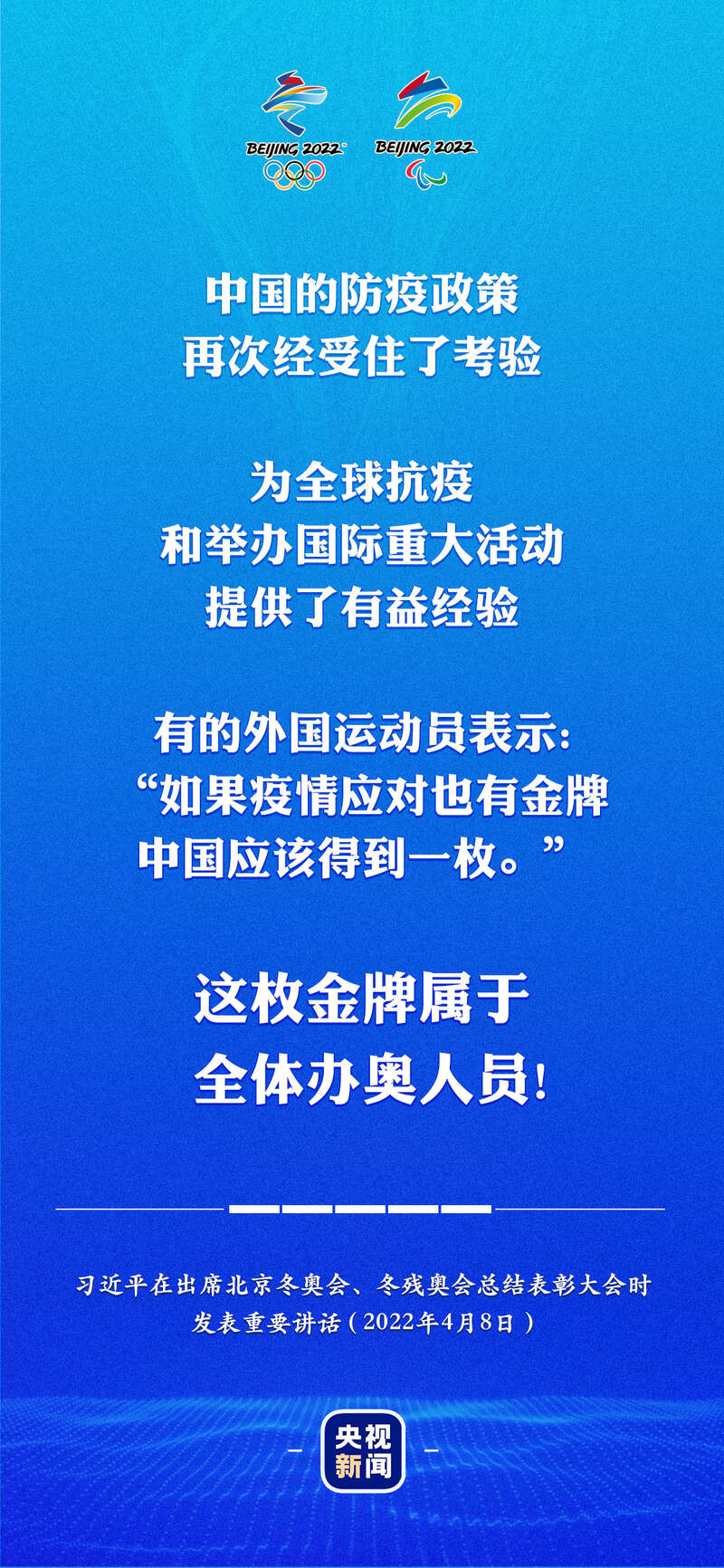 习近平:疫情防控精准有效,确保了冬奥安全顺利。在全球新冠肺炎疫情大流行背景下,我们把全部参与者的健康放在第一位,坚持“外防输入、内防反弹”,通过严格实施防控措施,有力保障了各方人员健康。赛时期间,闭环内阳性比例仅为0.45%,所有阳性人员都得到了有效治疗和良好照顾,没有发生聚集性、溢出性疫情,城市防控动态清零。中国的防疫政策再次经受住了考验,为全球抗疫和举办国际重大活动提供了有益经验。有的外国运动员表示:“如果疫情应对也有金牌,中国应该得到一枚。”这枚金牌属于全体办奥人员!