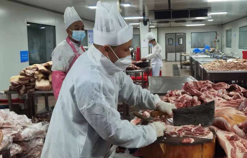 分拣包装也有“技术含量”。面对送来的整头猪,从没切过猪肉的80后青年志愿者陆建军拿起斧头似的专业刀具,现场向员工学习切肉技巧,很快“上手”。当天从早到晚,除了午餐时间,志愿者们一直没有休息,因为大家都知道,许多居民当晚拿到的应急食品就是从他们手上分拣装袋的。