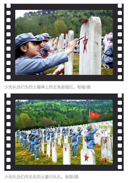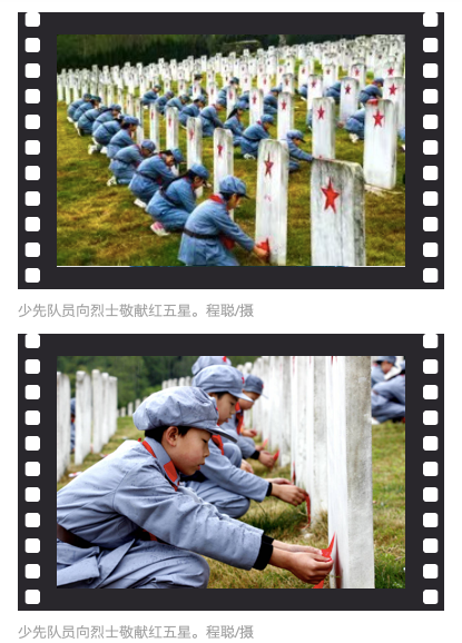 蒙蒙春雨中,面朝一座座洁白的烈士墓碑,少先队员们或半蹲着身子,或单膝跪着。在他们眼睛平视的前方,是墓碑上的五角星。