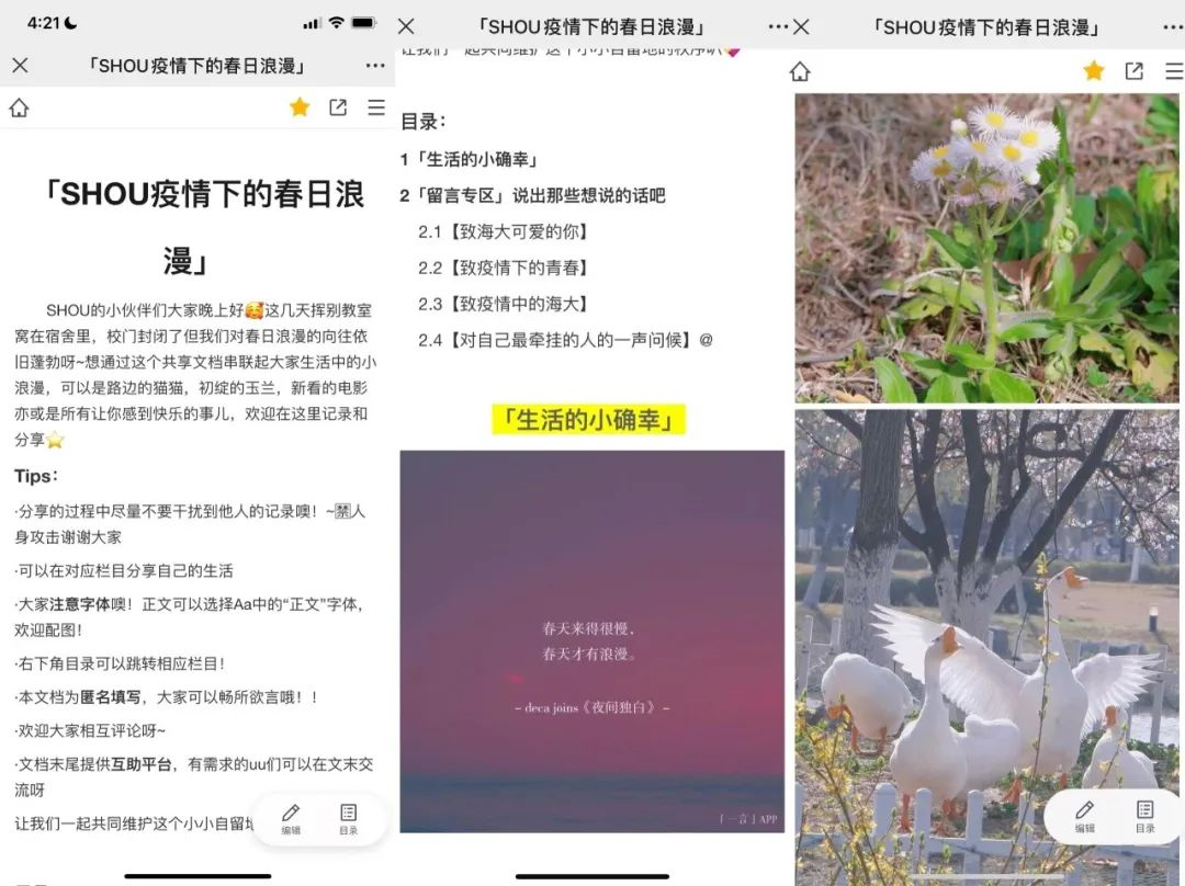 “没有一个冬天不可逾越、没有一个春天不会来临。”在共享文档中,上海海洋大学的师生共同书写春日里的“诗与远方”。