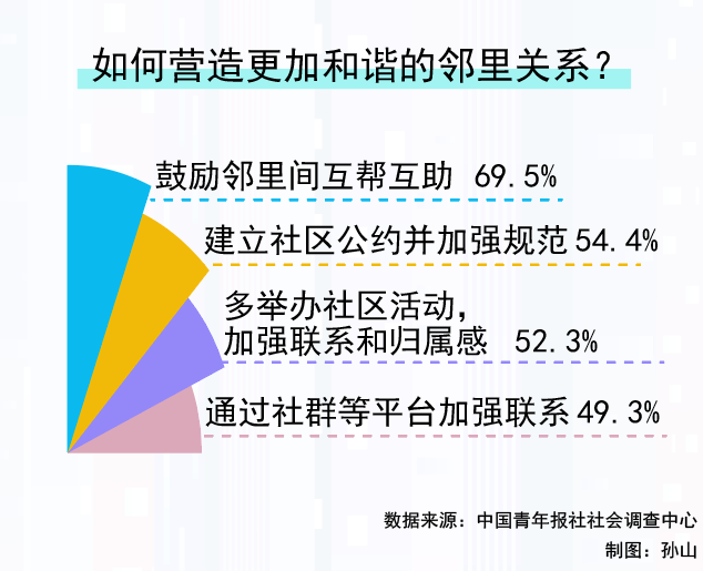 怎样有助于营造更加和谐的邻里关系?调查中,69.5%的受访者建议鼓励邻里间互帮互助,54.4%的受访者建议建立社区公约并加强规范。其他建议还有:多举办社区活动,加强联系和归属感(52.3%)、通过社群等平台加强联系(49.3%)和提升社区建设的专业化(26.2%)等。