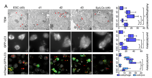 本研究构建了mCherry-GFP-LC3双荧光报告细胞系,利用体外胚胎干细胞naive-primed转换模型,通过电子显微观察及活细胞监测等技术阐述了naive态胚胎干细胞多能性转变过程中自噬通量的变化,证实了自噬对干细胞命运转变的决定性作用(图1)。