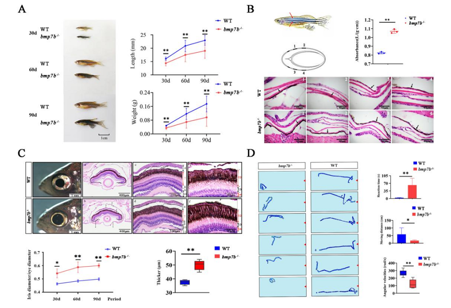 在研究中,华中农大科研团队通过CRISPR/Cas9介导的基因敲除技术在斑马鱼中构建了bmp7a和bmp7b纯合突变品系。发现其中bmp7a-/-突变体胚胎的背腹模式发育异常,从而在胚胎期发生死亡。Bmp7b-/- 突变体生长受到抑制,皮肤和眼睛视网膜中黑色素增多,摄食行为受到阻碍。