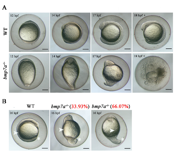 ▲野生型和bmp7a-/-突变体胚胎中的纯合致死表型观察