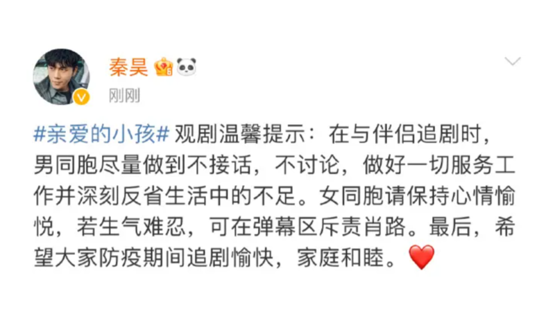 11日,求生欲满满的演员秦昊在微博分享观剧提示,“在与伴侣追剧时,男同胞尽量做到不接话,不讨论,做好一切服务工作并深刻反省生活中的不足。女同胞请保持心情愉悦,若生气难忍,可在弹幕区斥责肖路。最后,希望大家防疫期间追剧愉快,家庭和睦。”还有网友表示:“前排再提示一句:角色是角色,演员是演员!请去骂肖路,别骂秦昊。”秦昊的妻子伊能静也下场表示,“秦昊,你怎么可以这样对待你的老婆?”