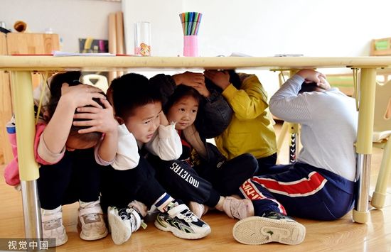 2022年4月14日,贵州黔东南,从江县第二示范幼儿园的小朋友们在老师的指导下学习应急避险技能。