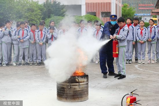 2022年4月14日,在浙江省湖州市德清县雷甸镇中心小学通航校区,消防队员向学生们讲解如何正确使用灭火器。