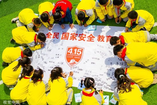 2022年4月14日,国网淮北供电公司志愿者在安徽省淮北市淮海东路小学和学生们一起开展国家安全活动。