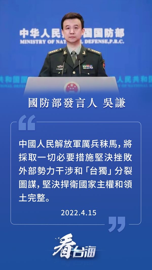 4月15日,中国人民解放军东部战区在东海当面和台岛周边海空域组织多军兵种联合战备警巡,并展开对海突击等科目演练。外交部、国防部和东部战区分别发声,直指此次行动就是对美议员团访台的反制,是对近期美方在台湾问题上频繁挑衅的回应。解放军厉兵秣马,采取一切必要措施坚决挫败外部势力干涉和“台独”分裂图谋,坚决捍卫国家主权和领土完整。