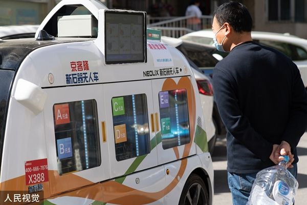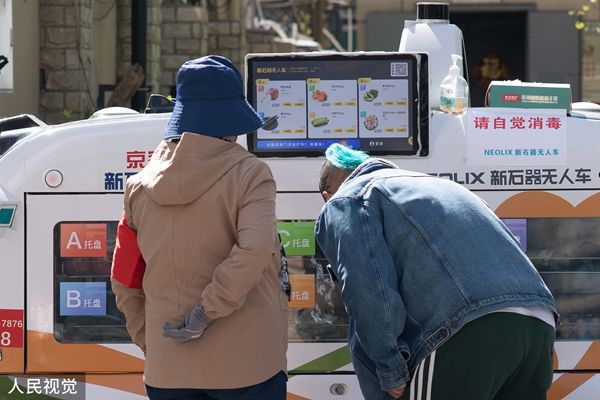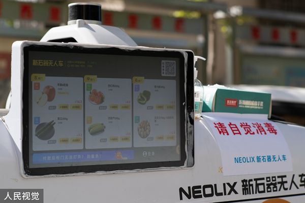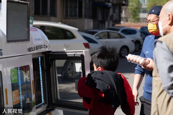 2022年4月14日,北京,“无人售卖车——移动无人超市”开进了酒仙桥管控小区,在网格区内走动售卖,提供蔬菜、果品等生活必需品。居民可直接自助扫码无接触购物。