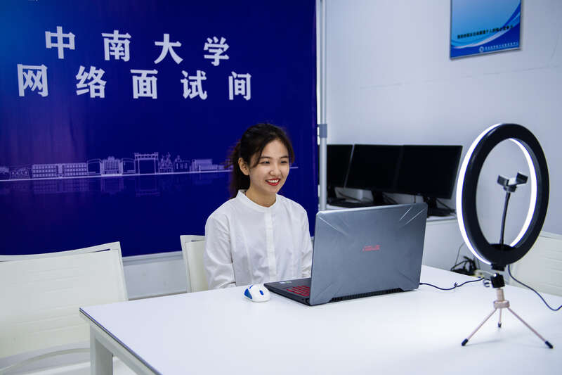 “网络面试间”助力高校毕业生升学求职。4月14日,在湖南长沙中南大学就业指导中心,学生在进行求职面试。