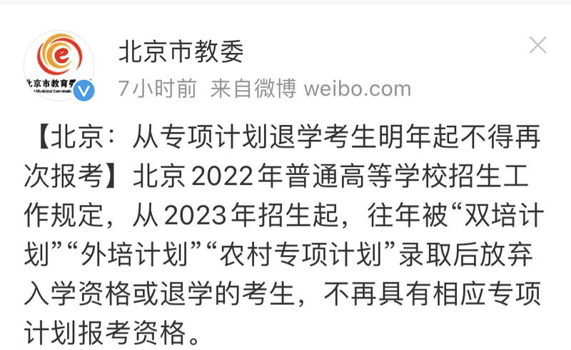 中国青年报客户端北京4月20日电(中青报·中青网记者 樊未晨)记者今天从北京市教委了解到,从明年起,往年被“双培计划”“外培计划”“农村专项计划”录取后放弃入学资格或退学的考生,不再具有相应专项计划报考资格。