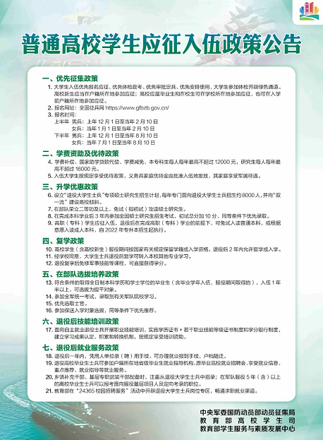 1. 大学生入伍优先报名应征、优先体检政考、优先审批定兵、优先安排使用,大学生参加体检开辟绿色通道。高校新生应当在户籍所在地参加应征;高校应届毕业生和在校生可在学校所在地参加应征,也可在入学前户籍所在地参加应征。
