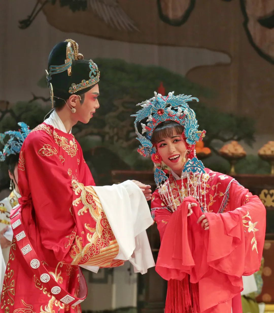 右为孙燕萍(女)、洪文翔在《五女拜寿》中饰演杨三春、邹应龙