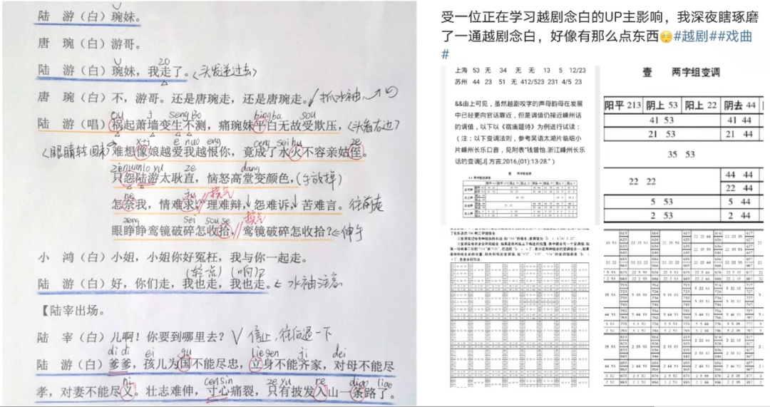 方言是戏曲的基础。从一个观众到一名演员,想唱好越剧,首先就得学习唱腔里的绍兴方言。纸上的念白旁,密密麻麻写满了标注,这是他们为了学习越剧而做出的努力的见证。