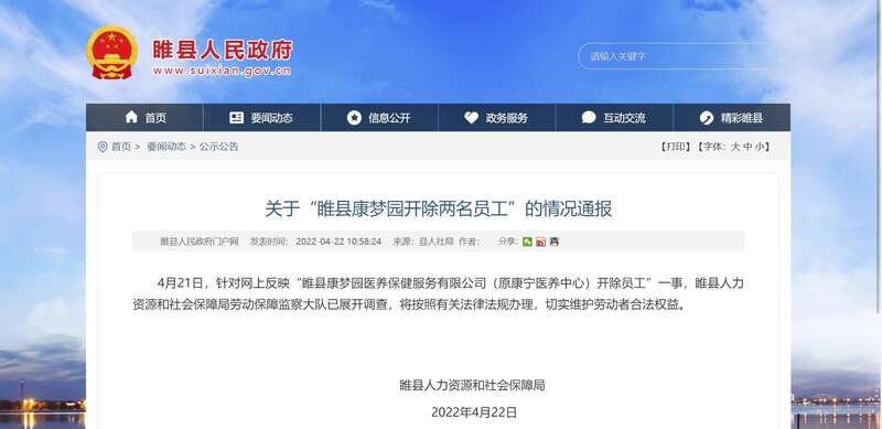 4月22日,睢县人民政府网站发布关于“睢县康梦园开除两名员工”的情况通报,全文如下: