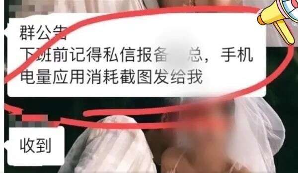 近日,湖北武汉一网友发文吐槽称,领导发布群公告要求员工下班前将手机电量消耗进行截图并发给相关人员检查,据爆料人介绍称,公司效益近期不好,才开始这样管理。此事被网友曝光后引发热议,有的网友称这类现象“早就不是什么新鲜事”。