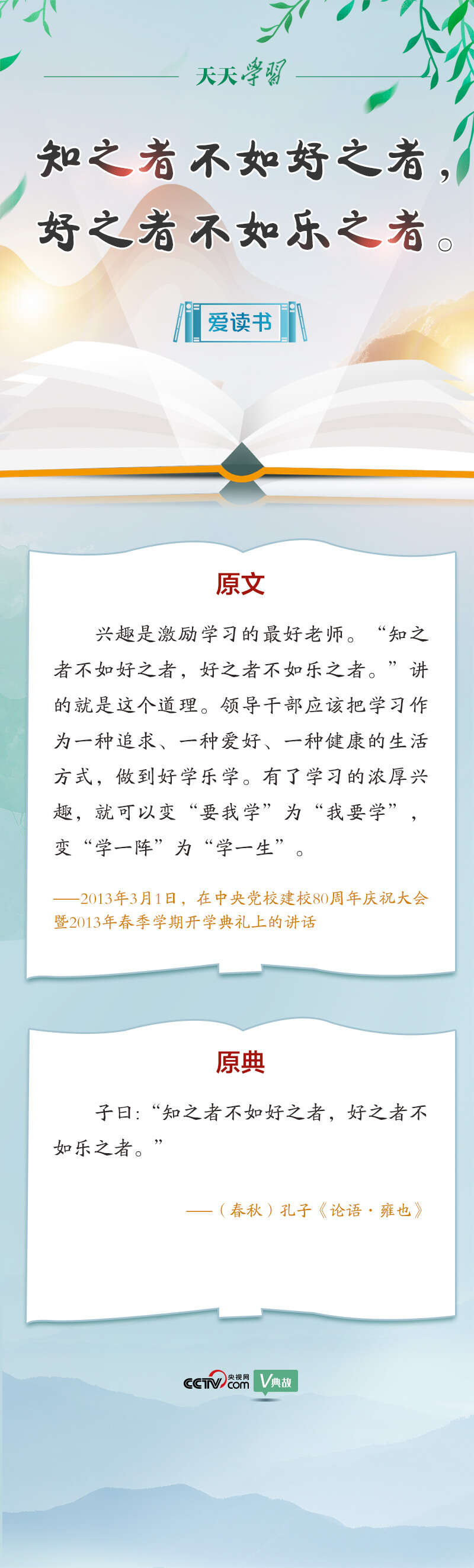 在第27个世界读书日到来之际,央视网《天天学习》与您一起重温习近平总书记爱读书、勤读书、读好书、善读书、擅用书所引述用典,学习领会习近平总书记的读书观,积极参加全民阅读活动,为中华民族的伟大复兴而努力读书,让智慧之光照亮我们每个人前行之路!