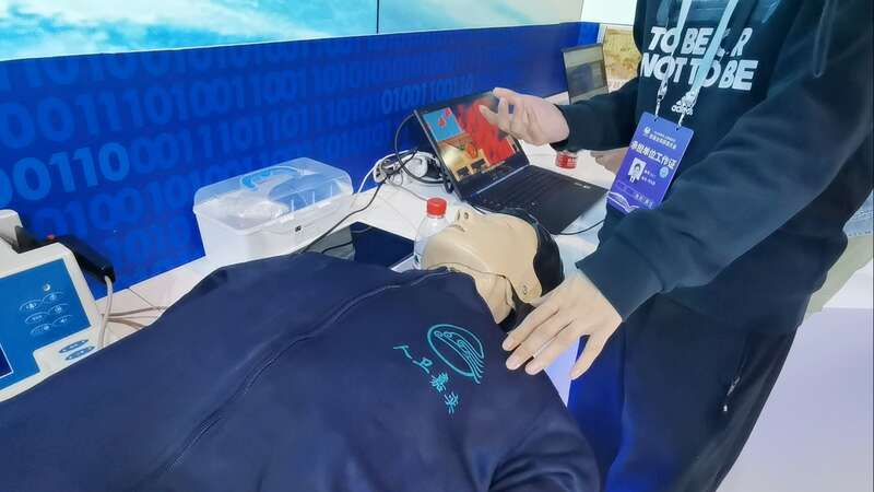 在展厅另一处,一具人体模型“不合时宜”的出现在全民阅读大会的展览中,这是人民卫生出版社开发的情境化模拟的综合急救训练系统。工作人员邱元昊介绍,这一系统可以模拟实急救场景以及急救场景下的伤员状态,比如火灾、车祸、溺水、地铁站、地震等,操作者可以沉浸式进行抢救体验,培养急救思维。