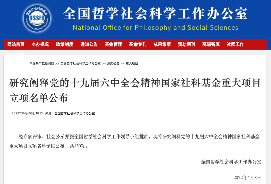 近日,全国哲学社会科学工作办公室公布了研究阐释党的十九届六中全会精神国家社科基金重大项目立项名单,共有130个课题批准立项。