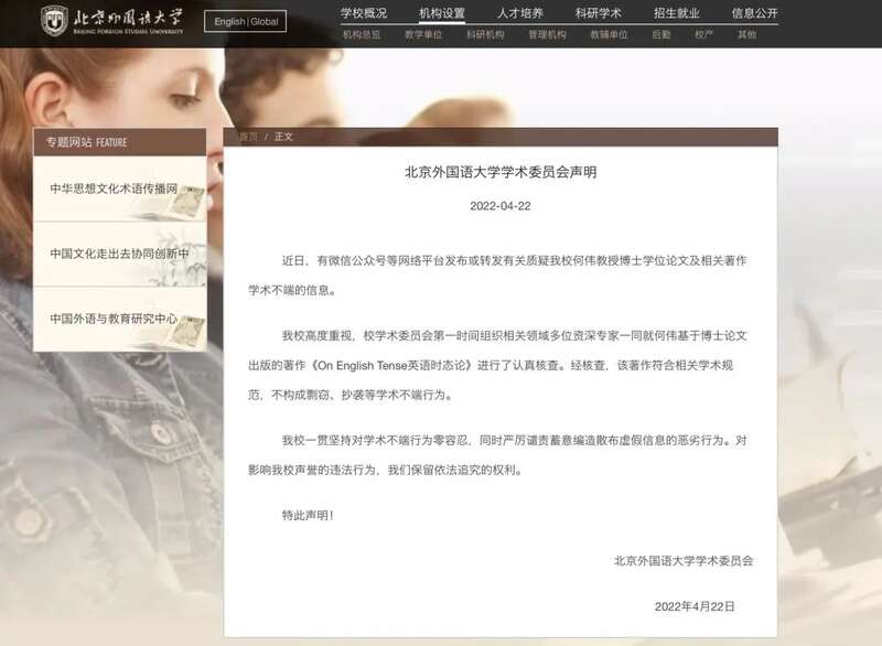 4月22日,北京外国语大学官网发布了该校学术委员会声明:“近日,有微信公众号等网络平台发布或转发有关质疑我校何伟教授博士学位论文及相关著作学术不端的信息。”