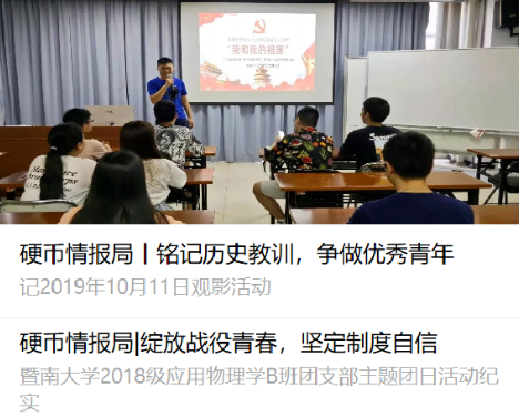 学习之余,作为2018级应用物理学B班班长的管威,热心班级事业,积极投身志愿服务。初入大学,管威便担任了班长一职,他面临的首要任务是提升班级凝聚力。面对新同学之间的互不熟悉,管威在班级公众号——“硬币树洞”中开设了人物专栏,以人物志的形式记录班级中的每个同学,让彼此有更多机会相互了解。此外,作为班级公众号小编的管威,还开设了思想专栏和学习专栏,和人物专栏一起构成公众号的三大专栏,用于丰富同学们的课余生活。