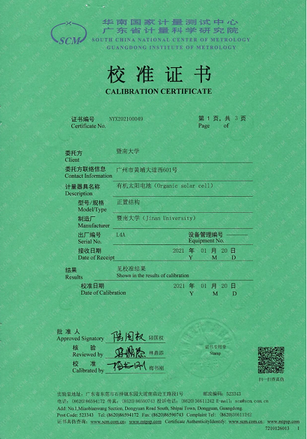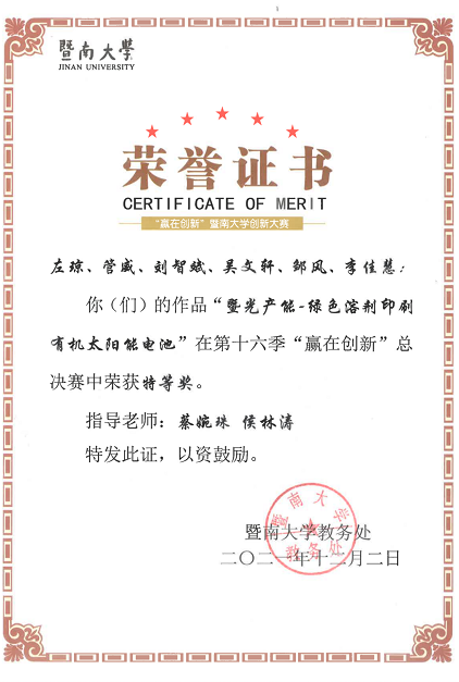 从早上6点到晚上12点,连续一个星期没日没夜泡在实验室,但研究也没有丝毫进展。实验遇到瓶颈的日子,导师蔡婉珠的鼓励,给予了管威坚持下去的动力——“没关系,不要放弃!我们一起讨论解决。”一遍又一遍尝试之后,管威所在课题组终于攻克难关,成功突破了绿色印刷有机太阳能电池效率验证的难题,获得了华南国家计量测试中心的专业认证。