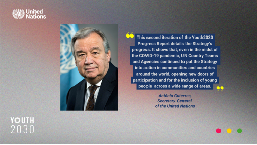 “战争、新冠肺炎疫情和气候危机给青年带来更多挑战,但青年也在抗击气候变化、捍卫种族平等和性别平等方面发挥着引领作用,推动实现更加包容、和平和繁荣的未来。” 联合国秘书长安东尼奥·古特雷斯先生在视频致词中谈到,“时不我待,我们将通过联合国青年战略,更好地服务青年,并与青年携手同行。”