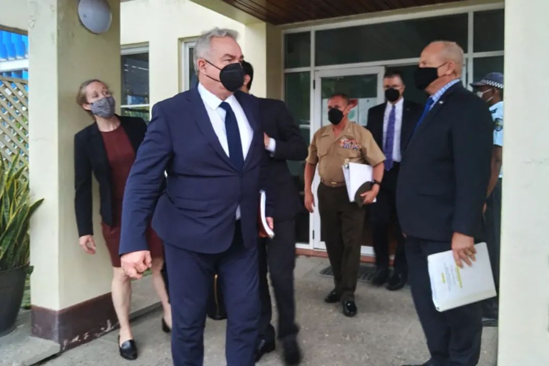 4月22日,所罗门群岛霍尼亚拉,美国代表团与所罗门政府会谈结束后离开。视觉中国供图