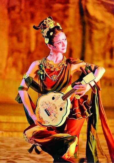 《龙门金刚》系由女舞蹈演员扮演十三位“伎乐天”,造型婀娜多姿,衣带飘拂,腾空飞舞。龙门石窟在雕刻时本土化趋势明显,“伎乐天”与“伎乐人”的造型、脸型、体态、服饰与唐朝世俗生活中的女性更为接近。在雕刻时,龙门石窟中的飞天雕塑与敦煌壁画中纤细灵动的形象不同,下半身稍胖。《龙门金刚》舞蹈中的“伎乐天”虽然身上披有很多轻盈的飘带,但舞姿造型较为沉稳,肃穆庄重,与“伎乐天”形象十分吻合。每位“伎乐天”手持乐器包括阮、箜篌、排箫、横笛、笙、钹、杖鼓,没有敦煌飞天的反弹造型,准确真实地还原了龙门石窟音乐图像状貌,再现了我国古代的音乐活动图景。