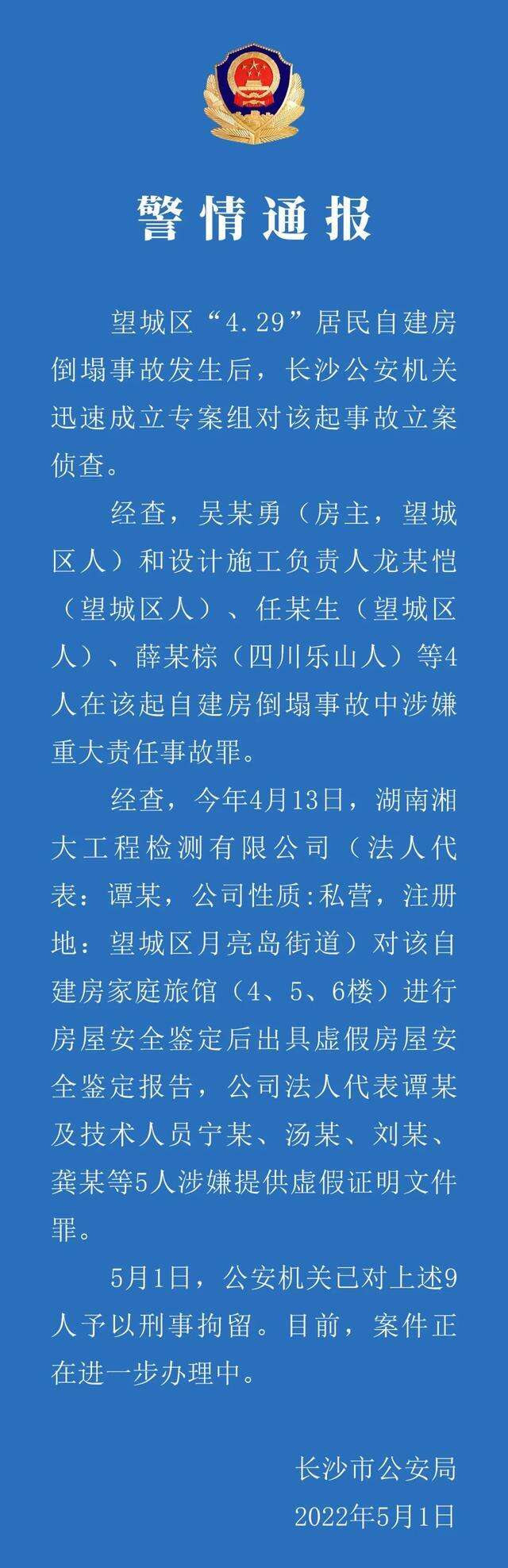 湖南长沙居民自建房倒塌事故后续:9名责任人被刑事拘留