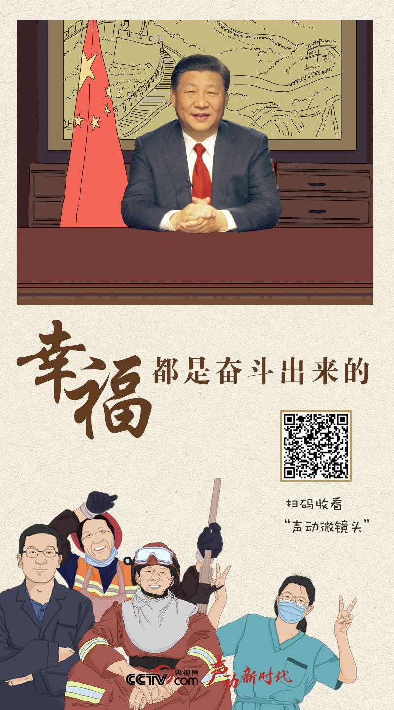 这是习近平以国家主席身份连续第五年在新年前夕发表新年贺词。一句“幸福都是奋斗出来的”,通过电视、网络传遍神州大地,引发亿万同胞共鸣。