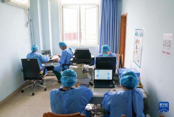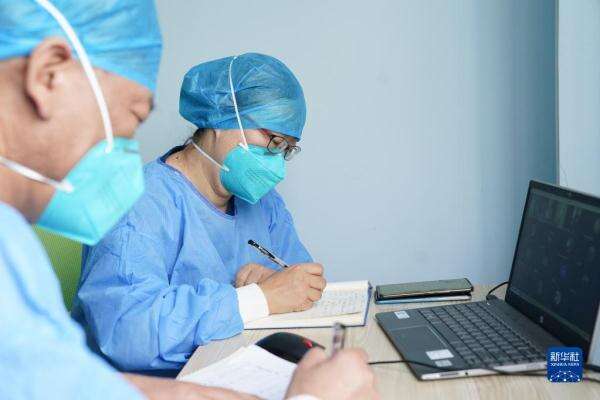 在上海市普陀区利群医院,吴颖(右)在办公室开线上会议(4月30日摄)。