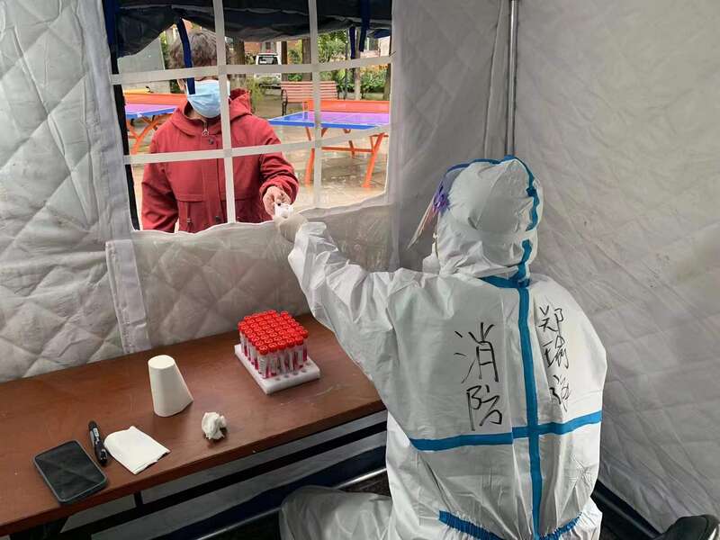 北京通州消防抗疫志愿服务队队员协助环球度假区员工进行核酸检测。(北京通州消防/供图)