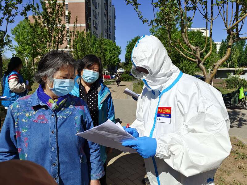 北京平谷消防防疫志愿服务队志愿者帮助居民登记信息。(北京平谷消防/供图)