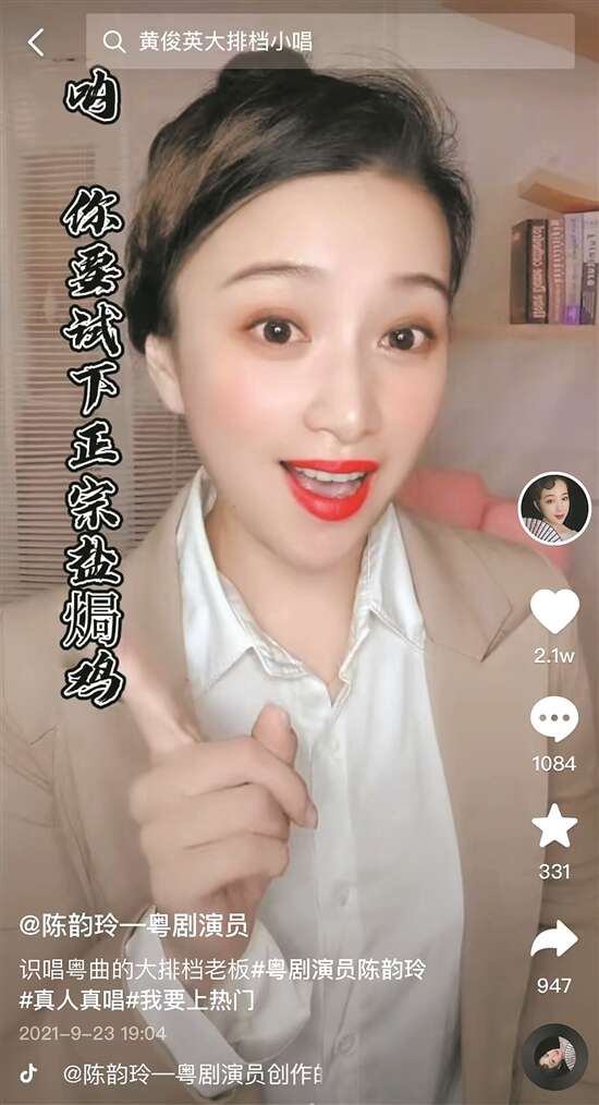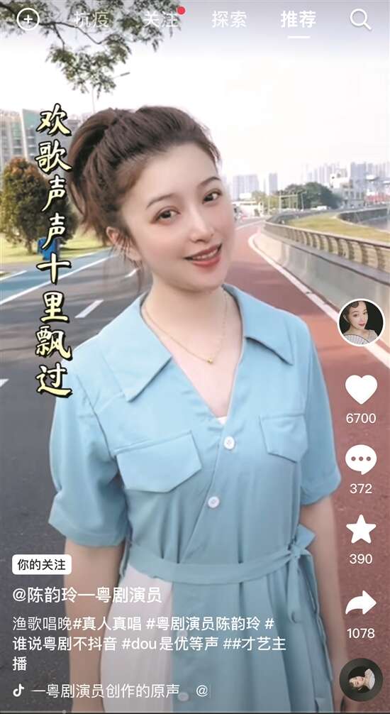 陈韵玲如今在抖音的粉丝已经超过11万,她介绍,这些粉丝的年龄从20岁到50岁不等,“很多都是年轻的小女孩,她们在刷抖音的时候偶然发现粤剧原来这么好听,通过关注我,再去挖掘更多对戏曲的兴趣”。她也关注到抖音推出了“DOU有好戏”计划,助力全国的戏曲行业振兴,“这是一件弘扬传统文化的好事,希望能有更多年轻的戏曲人找到自己的观众”。