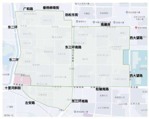 东二环以东,广和路、垂杨柳南街及南磨房路以南,西大望路以西,十里河斜街、左安路和松榆南路以北的合围区域(中国医学科学院肿瘤医院、北京市垂杨柳医院和北京工业大学部分区域除外),涉及劲松、潘家园、双井、十八里店等4个街道和地区。