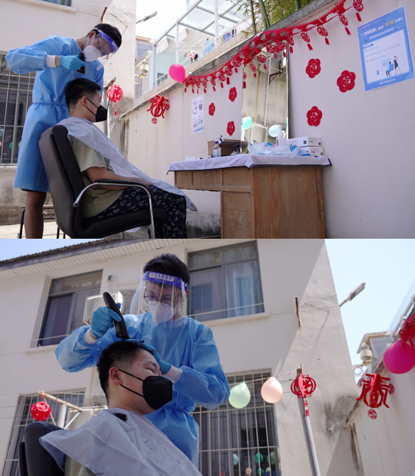 气球、自制海报、红色福字彩纸、半身镜……西南十楼的户外理发盒子氛围感十足。除了梳子、理发工具、消毒工具,驻楼楼长和辅导员们还对理发场地进行了精心布置。“想让小伙子们体验感更好一点,学生们自己设计了海报,我们又找出了以前联欢活动剩下的道具,只差一个转灯了。”
