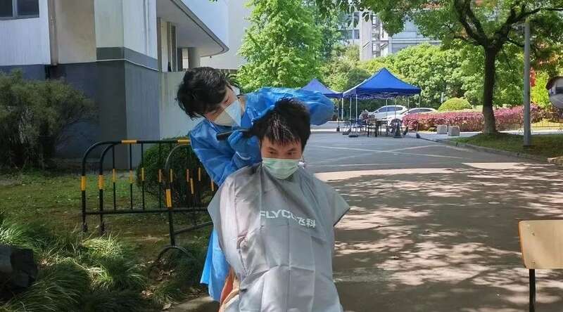 同样重拾理发手艺的还有西北三楼的保洁马阿姨,“刚开始有点手生,剪完两个就找到了年轻时候的感觉。”西北三楼的“托尼天团”,堪称豪华,楼内学生、驻楼辅导员和保洁阿姨齐上阵,一个下午,12位同学和2位保洁大叔重获清爽短发。