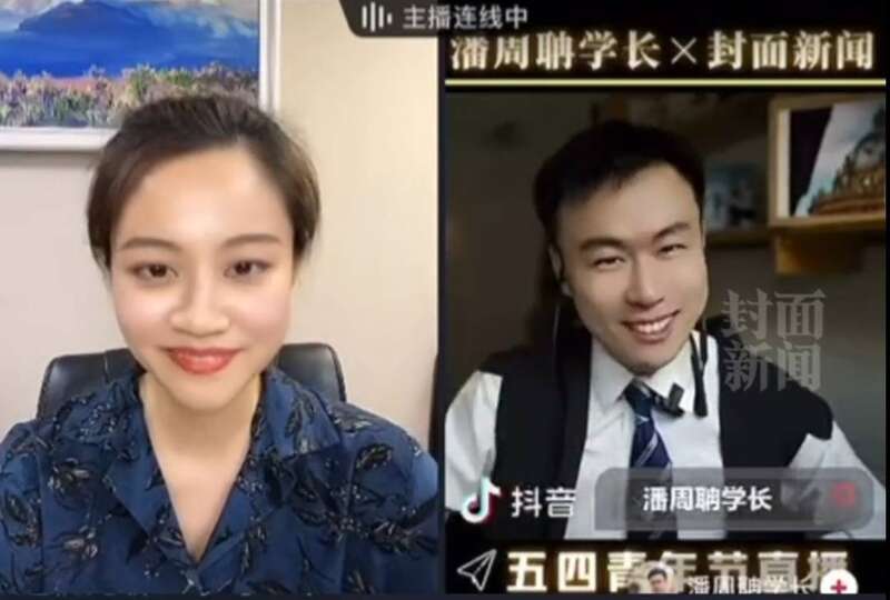 5月4日晚9点半,潘周聃做客封面新闻抖音直播间,通过与封面新闻主播连麦的方式,在线解构“潘周聃出场方式”精髓。因为潘周聃十分健谈,连麦持续到深夜11点。他缜密的思路、丰富的知识以及超快的语速,让一些网友忍不住留言:“我的智商和见识不允许我听下去。”
