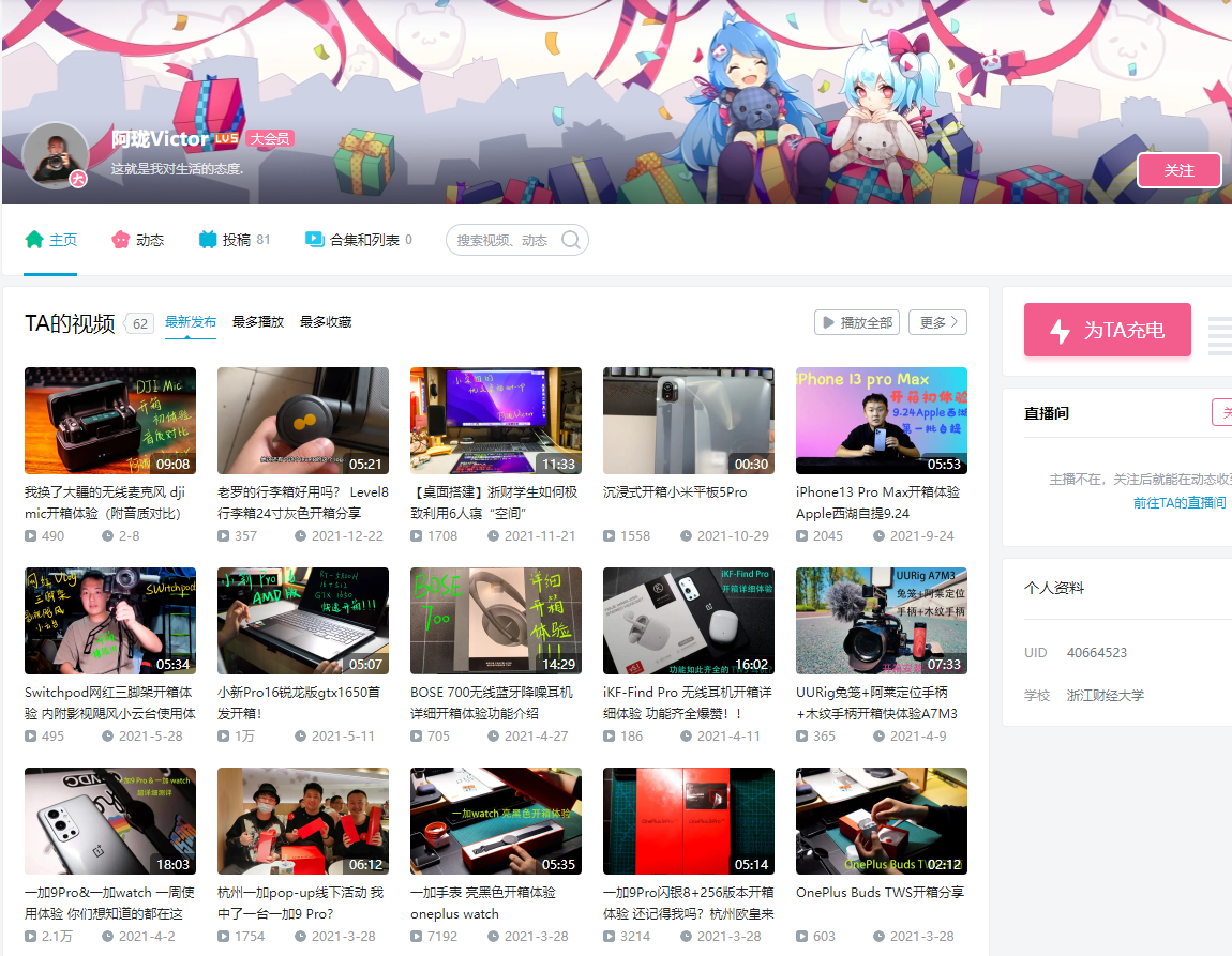 升入高中后的阿珑并没有因学习压力而放弃对新媒体的探究。他在Bilibili开创“阿珑Victor”账号,尝试自媒体经营。在此期间,阿珑接触到了高级拍摄器械及后期技术,凭借多次新机评测的视频,顺利地搭上了早期B站科技区的热度快车。“刚入驻b站的最初三个视频分别是961次播放,1万播放,1.6万播放。当年不断上涨的播放量也给我在创作上给予很大动力。”阿珑坦言。而B站的“创作激励100元”成为了他在此行业的第一桶金,也激励了他对自媒体进一步的探索。