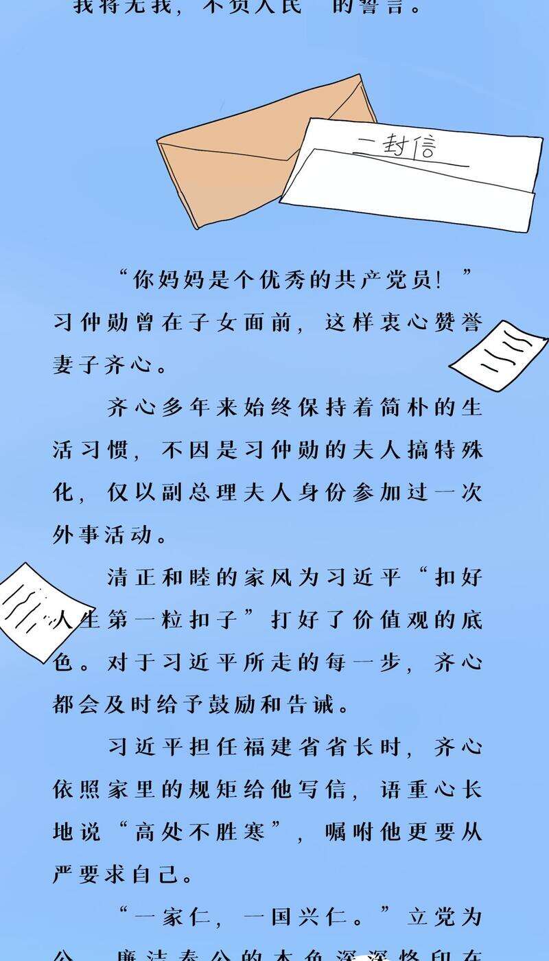 “重言传、重身教,教知识、育品德”,在培育子女上,齐心始终以身作则,以优秀的家风感染、教育子女们。在对习近平的期望中,更有一份对国家和人民的责任与担当。