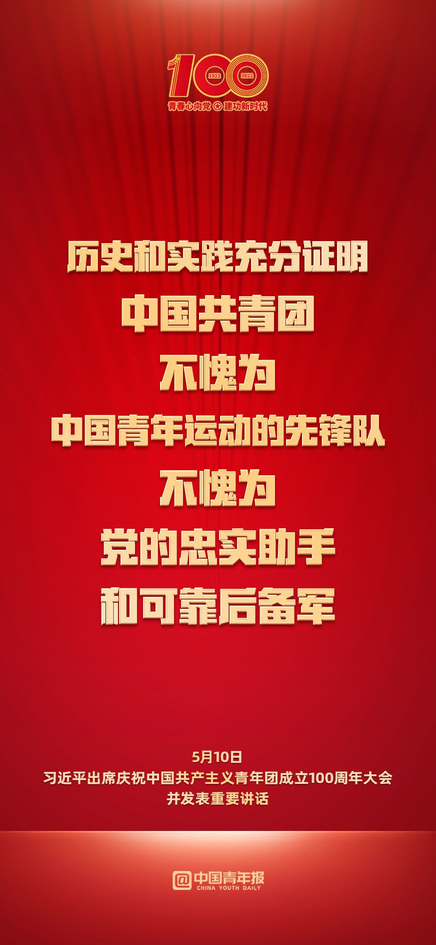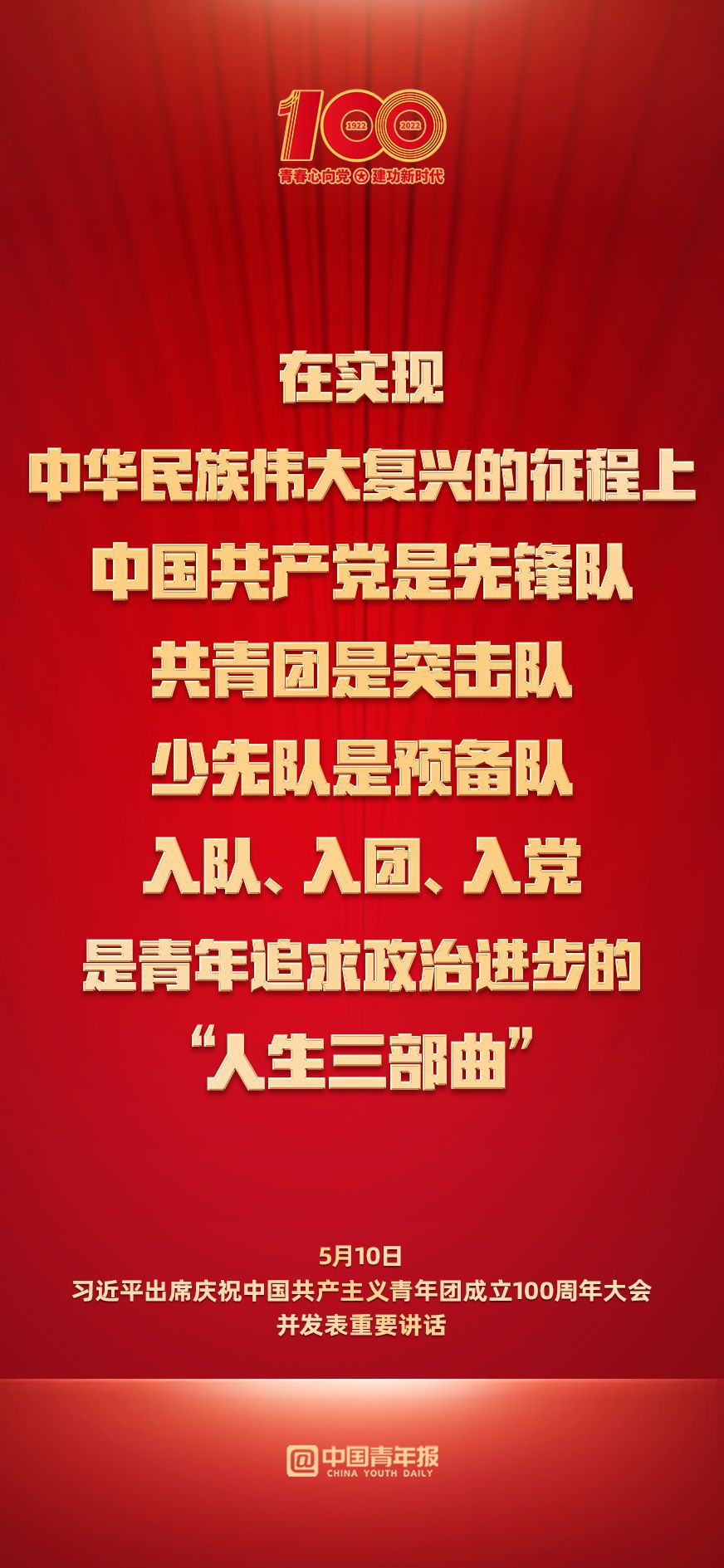 习近平总书记在庆祝中国共产主义青年团成立100周年大会上的讲话中指出:“千百年来,青春的力量,青春的涌动,青春的创造,始终是推动中华民族勇毅前行、屹立于世界民族之林的磅礴力量!”自中国共产党和中国共青团诞生以来,一代代中国青年在党、团组织引领帮助下,投身时代洪流、赓续红色血脉,谱就一曲曲辉煌激越的青春赞歌。