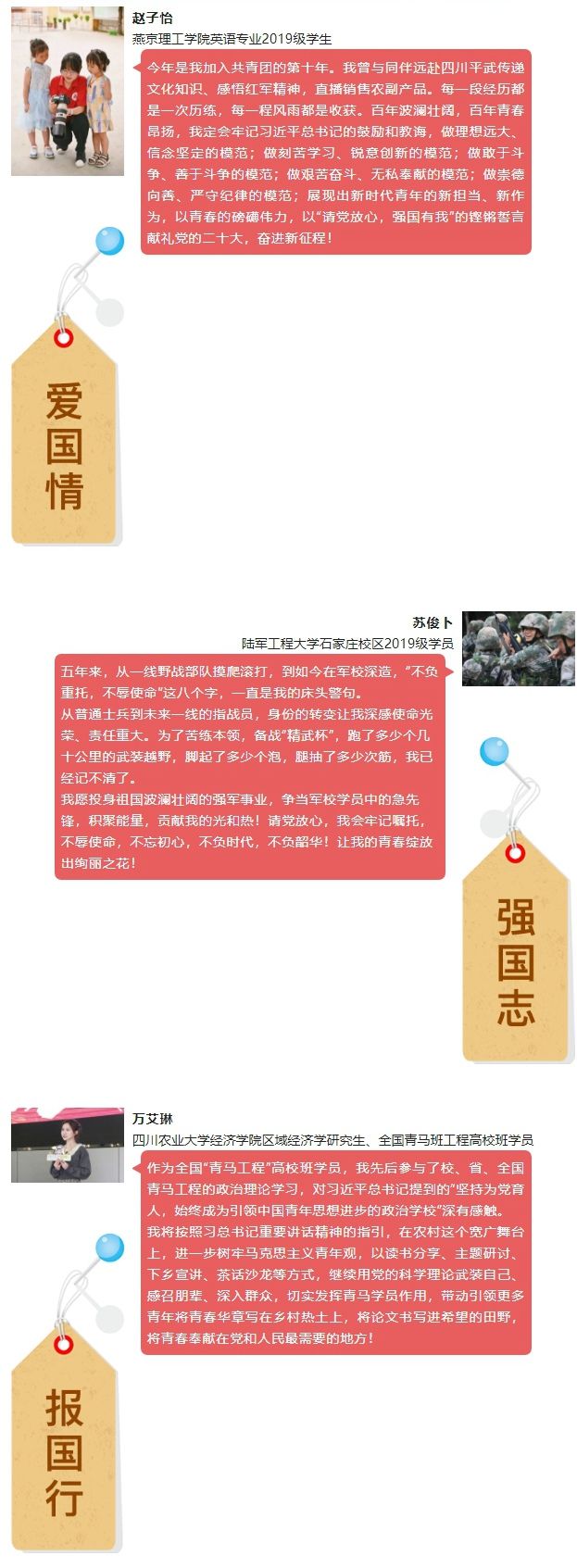 习近平总书记的重要讲话催人奋进!作为一名在高校共青团工作了8年的团干,我深知共青团工作的重要性。从校内到校外、从社区到乡村、从井冈山到右玉,我们带领青年学生开展党的理论政策宣讲、关爱农村留守儿童、重走红军路等系列实践活动,助力青年学生在实践中成长成才!今后,我将深入贯彻落实习近平总书记的重要讲话精神,积极引导广大青年学生坚定理想信念,永远跟党走,为培养更多新时代好青年贡献力量!